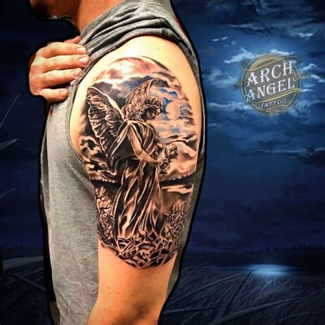 Fantastic warrior angel tattoo on man back shoulder. See more ideas about archangel gabriel, tattoos, gabriel. You can also get a smaller design with an inspiring word on it. The time eye is a full sleeve angel tattoo that has the eye at the top looking at you. Another choice for men getting angel tattoos is to have a guardian.