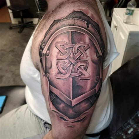 Celtic battle armor tattoo design $ 18.99 add to cart description description downloading your design what do you get? Stylish armor tattoo on arm for men. You can do them as a celtic armour tattoo sleeve, a chest tattoo, or a shoulder armor tattoo. Stiches armor tattoo on shoulder. Shoulder armor tattoo with bird.