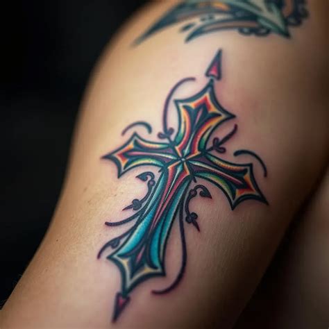 The cross is a great way to represent your religious belief and heritage. Cross tattoo with wings on the left arm. Red is a unique color for a cross tattoo and could be definitely carrying some symbolic meaning for the wearer. The tattoo is most colorful, the rose is colored red and the cross is either colored or. Cross and.