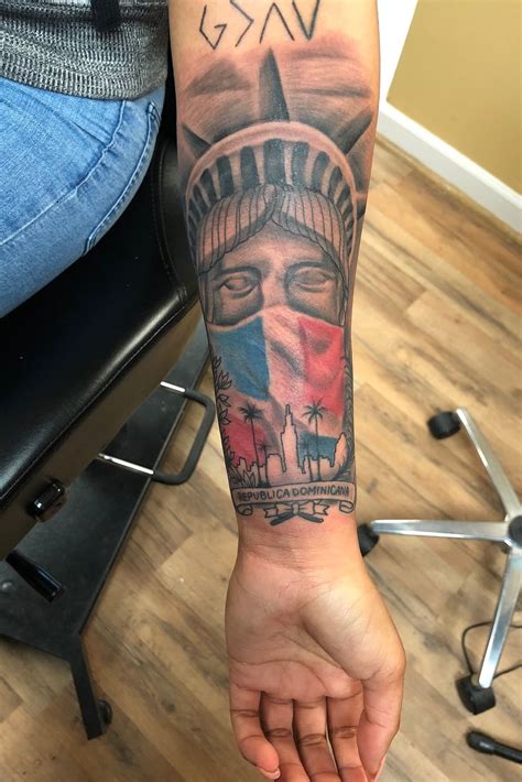 Dominican republic face dust shield mask with fluid and moisture resistant fabric. Unlike certain european countries which shall remain unnamed, the american flag is easily distinguishable. American flag sleeve in black shade combined with dominican flag, angels, daisies, rose window from st vitus cathedral, doves and initials. Ripped skin american flag tattoo design is in trend since the early 2000s..