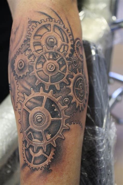 Biomechanical black for men other. Black ink three gears tattoo on side rib. A black and gray biomechanical tattoo design for men. This metal gear sleeve tattoo on the leg shows another way to create a dark yet realistic portrayal of the trope.