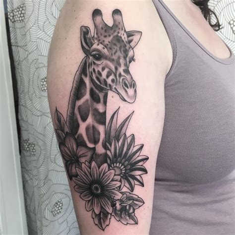 Traditional giraffe head with flower tattoo design for sleeve. You should also know that giraffes are symbols of intuition, patience, resourcefulness and dependability. Giraffe with patterning and heart, based on an illustration by caroline johansson, this black ink tattoo was created by yanina viland. Small giraffe tattoo is a great tattoo because it fits on any part of your body..