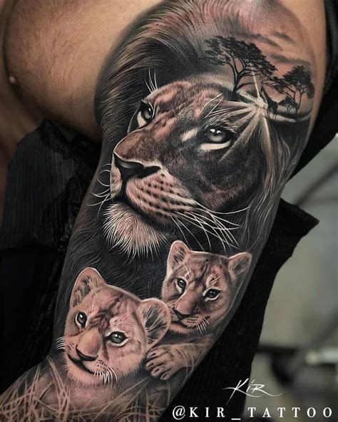 Despite being known as a ferocious beast, the noble lion is also a symbol of silent confidence and inner peace. It’s easy to do and it will look perfect on any part of your body. The beautiful lion tattoo with cub on the upper half sleeve looks cool and very attractive for men. This is a lion baby cubs it's.