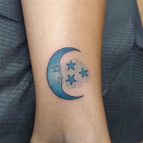 For most women, this design represents family and the closest of friendships. This tattoo of moon is inked in blue with white and yellow stars around it. The howling wolf looks so real. A star tattoo is typically seen with a crescent moon tattoo design to symbolize good luck as well, different cultures have different interpretations of what the moon..