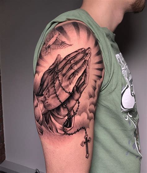 Many people choose to include pictures of doves, roses, or rosary beads alongside the praying hands. I mean, you look cool plus you remember god at the same time with this one. The cross is held partly while the rest extend upwards above the hands. Praying angel tattoo can be inked on the shoulder, hands or back. In fact, approximately.